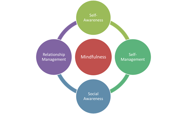 Mindfulness behaviors are the heart of EI. Without mindfulness, success in self-awareness, self-management, social awareness, and relationship management is not possible.